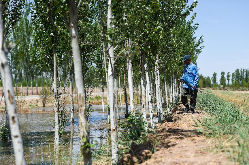 工人在內(nèi)蒙古巴彥淖爾臨河區(qū)國營新華林場管護(hù)樹木(2024年5月26日攝)。數(shù)十年來,林場結(jié)合“三北”防護(hù)林、京津風(fēng)沙源治理、低質(zhì)低效林改造等生態(tài)工程,持續(xù)提高森林覆蓋率。