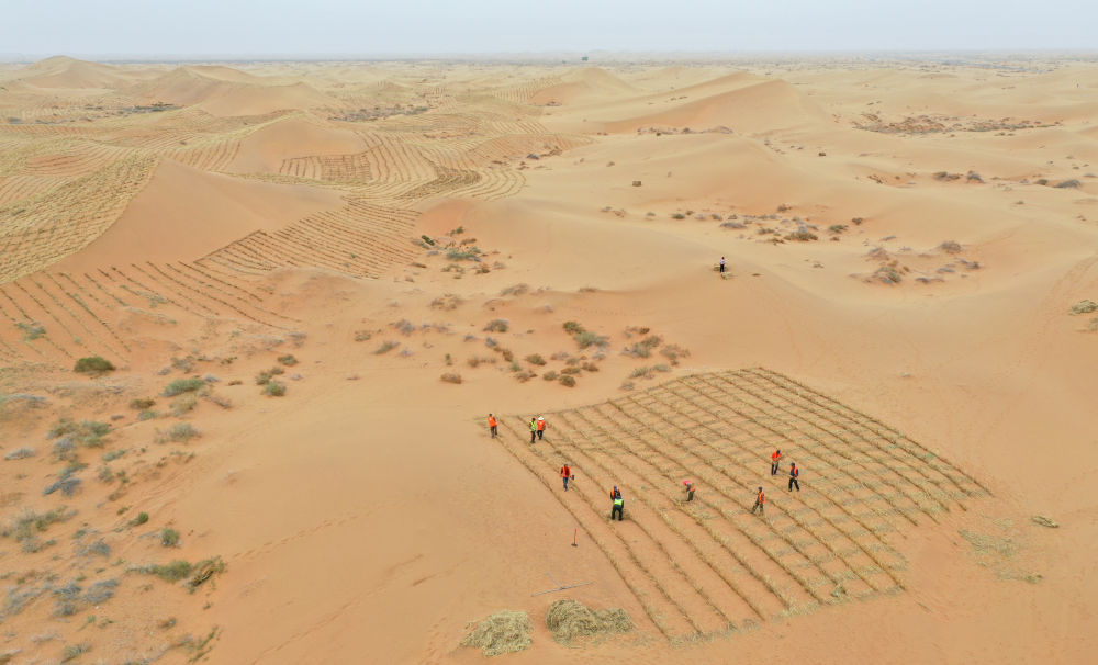 2024年4月27日,治沙工人在內(nèi)蒙古阿拉善左旗騰格里沙漠S315沿線固沙工程現(xiàn)場用稻草扎草方格(無人機(jī)照片)。