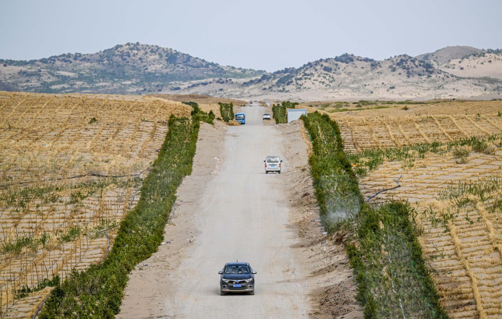 在內(nèi)蒙古赤峰市翁牛特旗巴彥呼交嘎查其白線防沙治沙項(xiàng)目區(qū),穿沙公路將沙地切割,沙丘被逐步固定(2024年5月16日攝,無人機(jī)照片)。