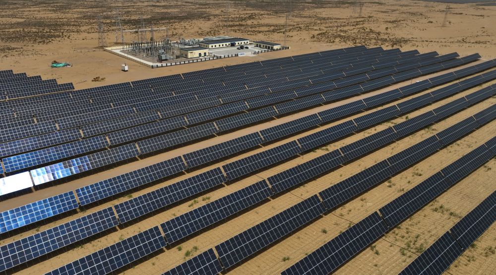 2024年5月16日在內(nèi)蒙古巴彥淖爾市磴口縣拍攝的烏蘭布和沙漠光伏基地(無人機(jī)照片)。烏蘭布和沙漠建設(shè)生態(tài)光伏基地,采取板上發(fā)電、板下種植的辦法,努力把沙海變?yōu)椤熬G?!?。