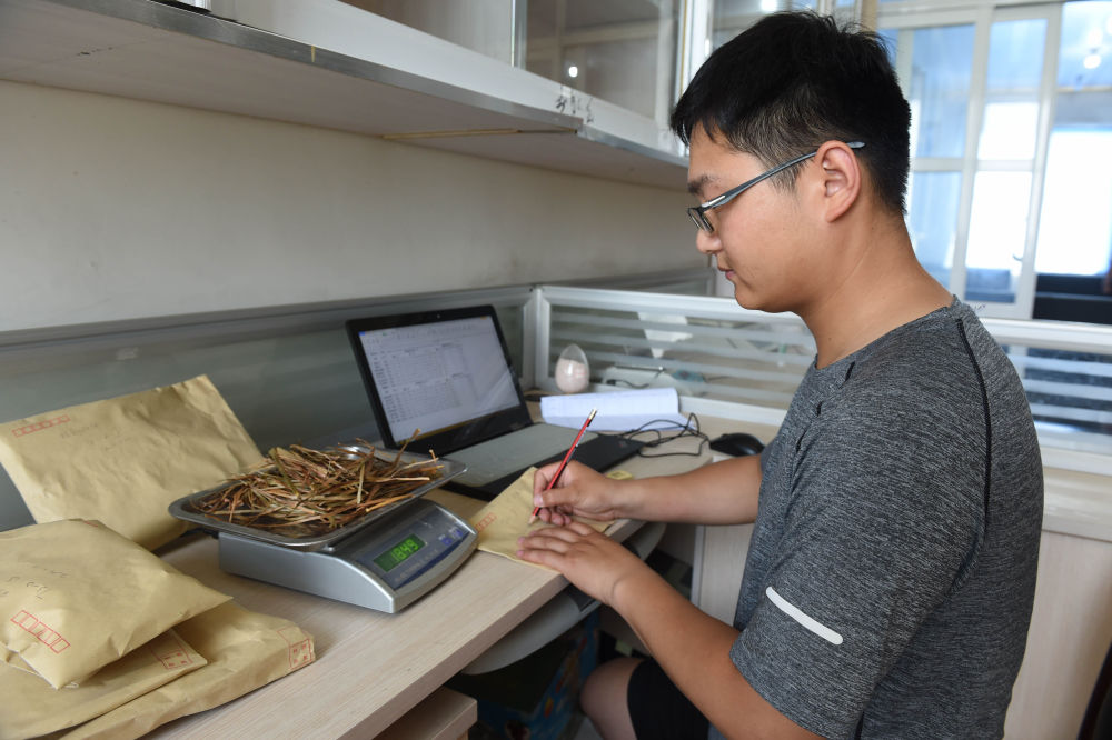 2022年6月28日,在太和縣淙祥現代農業(yè)種植專業(yè)合作社,徐旭東在實驗室對農作物樣品進行稱重和記錄。