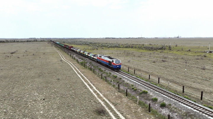 2023年5月12日,在哈薩克斯坦阿拉木圖附近,貨運(yùn)列車(chē)馳騁于阿拉木圖與中國(guó)霍爾果斯間(無(wú)人機(jī)照片)。
