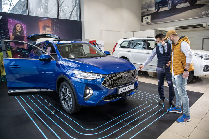 2021年4月1日,銷(xiāo)售人員在哈薩克斯坦阿拉木圖市經(jīng)銷(xiāo)商店向消費(fèi)者介紹哈弗汽車(chē)。