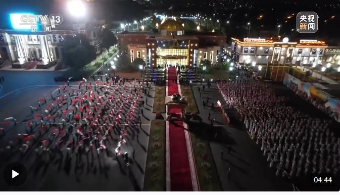 1500多名身著民族盛裝的塔吉克斯坦青年表演富有濃郁特色的中塔歌舞,揮舞中塔兩國國旗,表達(dá)對中國最尊貴客人的熱烈歡迎。