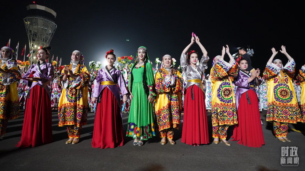 1500多名身著民族盛裝的塔吉克斯坦青年,表演富有濃郁特色的中塔歌舞,揮舞中塔兩國國旗,表達對中國領(lǐng)導(dǎo)人的熱烈歡迎。