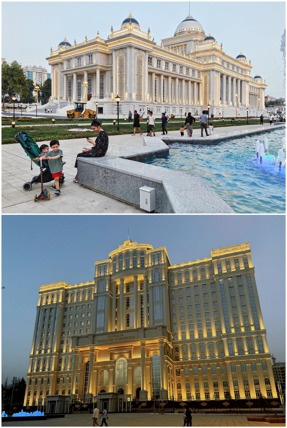 塔議會(huì)大樓、政府大樓坐落于杜尚別著名的魯達(dá)基大道,相隔數(shù)百米。議會(huì)大樓同總統(tǒng)府相望,政府大樓則俯瞰杜尚別另一條交通干道——索莫尼大道。兩座大樓融合歐亞古典柱廊結(jié)構(gòu)、塔吉克民族特色雕刻、伊斯蘭文化風(fēng)格的設(shè)計(jì),外觀大氣、典雅莊重,同魯達(dá)基大道兩側(cè)的古樹、鮮花、噴泉相映成景。