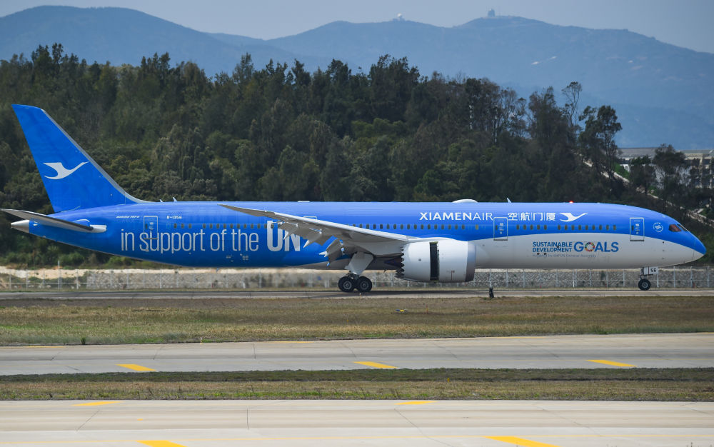 2018年3月21日,聯(lián)合國特殊涂裝飛機廈門航空“聯(lián)合夢想號”正式在福建福州長樂國際機場亮相。新華社記者 宋為偉 攝
