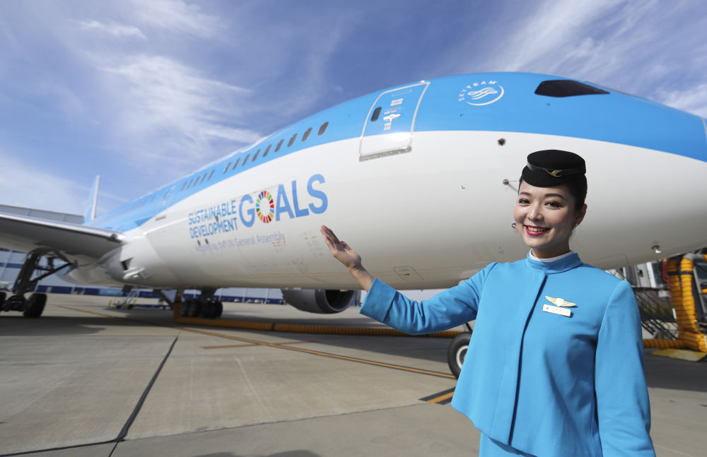 2018年1月26日,在美國查爾斯頓波音工廠,中國廈門航空公司的一名空乘人員展示廈航首架涂裝宣傳聯(lián)合國可持續(xù)發(fā)展目標(biāo)的客機。新華社記者 王迎 攝