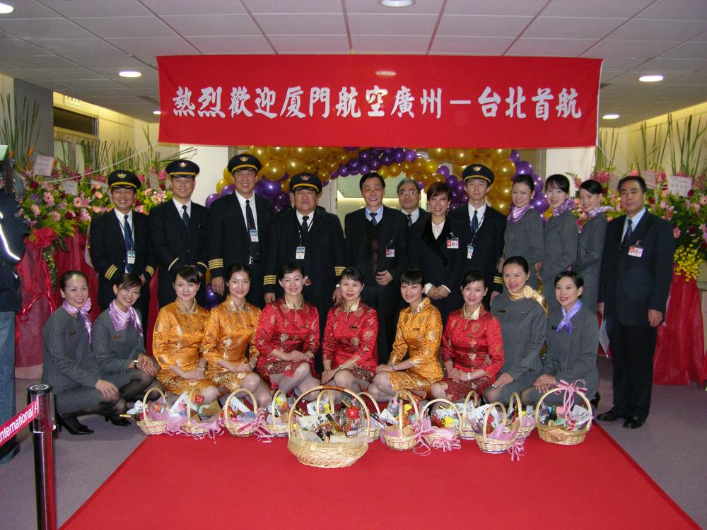 2005年,海峽兩岸首次開放春節(jié)包機。這是2005年1月29日,廈航作為大陸6家參與臺商春節(jié)包機直航的航空公司之一,圓滿完成了廣州-臺北往返包機任務(wù)。這是廈航首航臺北機組成員在臺北與迎接人員親切合影。