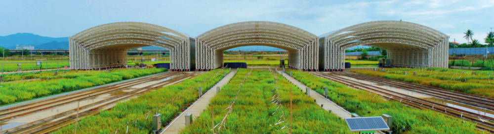 在位于三亞的國家耐鹽堿水稻技術創(chuàng)新中心崖州灣總部科研試驗基地,建設了高標準試驗田、鹽(堿)性精準鑒定鹽池、自動防雨鋼棚、水土鹽堿度智能化監(jiān)測系統(tǒng)等配套設施(2024年5月17日攝)。黎多江攝/本刊