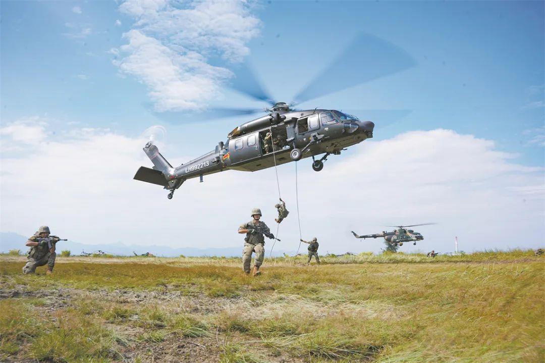 第72集團(tuán)軍某旅某合成營(yíng)官兵在陸航部隊(duì)配合下開展機(jī)降訓(xùn)練。