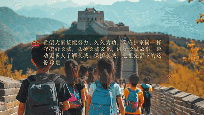 希望大家接續(xù)努力、久久為功,像守護(hù)家園一樣守護(hù)好長城,弘揚(yáng)長城文化,講好長城故事,帶動(dòng)更多人了解長城、保護(hù)長城,把祖先留下的這份珍貴財(cái)富世世代代傳下去,為建設(shè)社會(huì)主義文化強(qiáng)國、推進(jìn)中國式現(xiàn)代化貢獻(xiàn)力量。