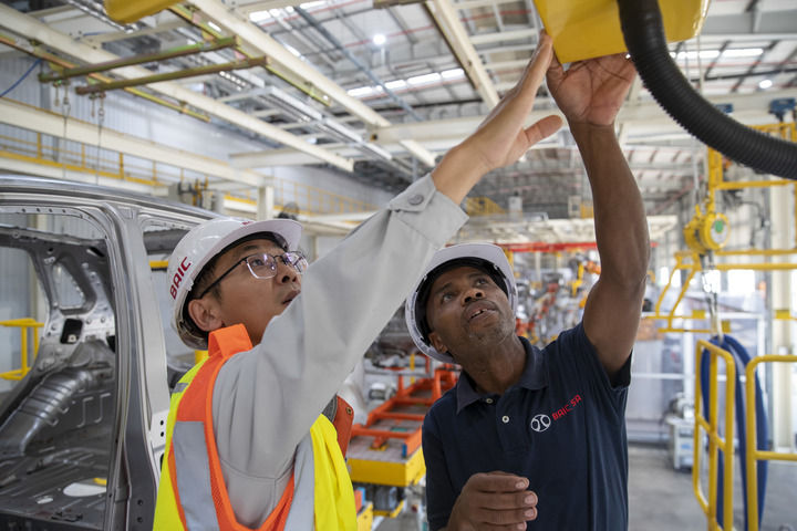 2023年5月9日,在南非東開普省北汽南非工廠,電工邦加尼(右)與中國同事方龍?jiān)诤秆b車間內(nèi)工作。新華社記者 張譽(yù)東 攝