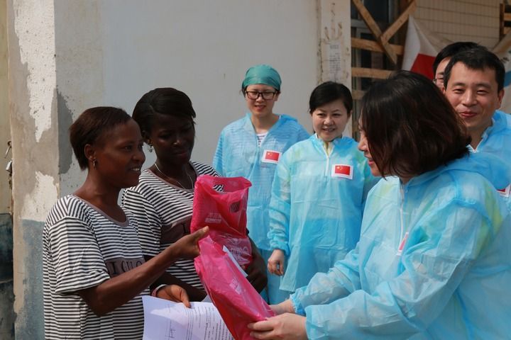 2015年4月4日,在位于塞拉利昂首都弗里敦市郊的中塞友好醫(yī)院埃博拉診療中心,中國第四批援塞醫(yī)療隊(duì)副隊(duì)長邵蔚(右前)向被治愈的埃博拉出血熱患者贈(zèng)送禮物。新華社發(fā)(祖榮強(qiáng) 攝)