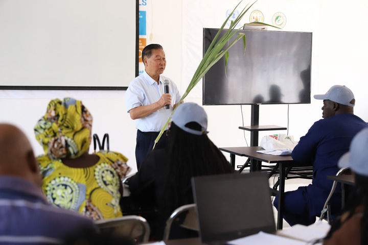 2024年8月4日,在位于盧旺達(dá)南方省胡耶區(qū)的中國援盧農(nóng)業(yè)技術(shù)示范中心,菌草發(fā)明人林占熺為培訓(xùn)班學(xué)員講解菌草技術(shù)。新華社發(fā)(黃萬晴攝)