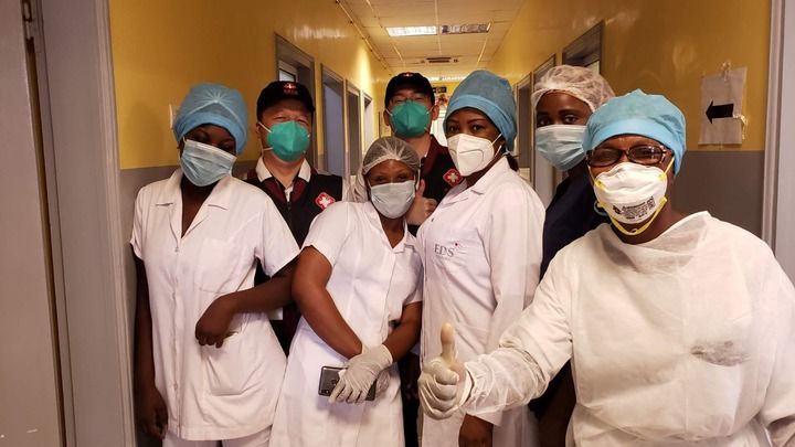 2020年5月26日,中國抗疫醫(yī)療專家組在剛果(布)首都布拉柴維爾指導(dǎo)新冠肺炎病房建設(shè)時(shí),與當(dāng)?shù)匾痪€醫(yī)務(wù)人員合影。新華社發(fā)
