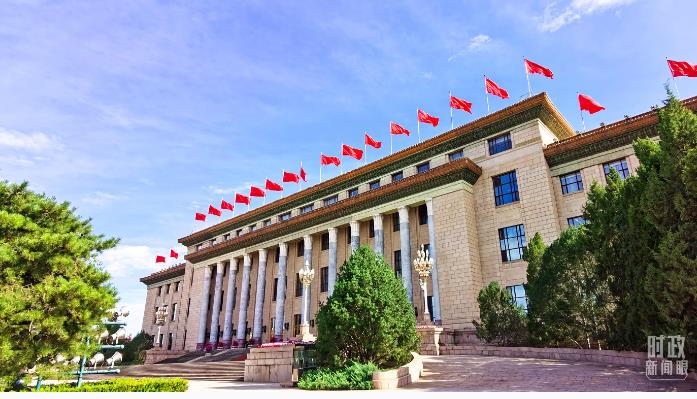 人民大會堂擺放的旗陣。(總臺央視記者馬超拍攝)