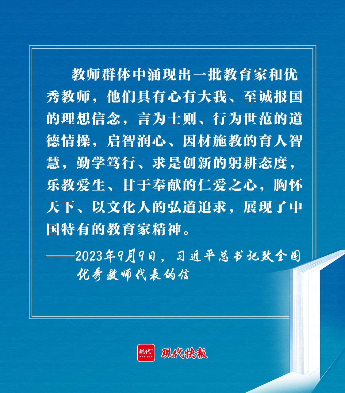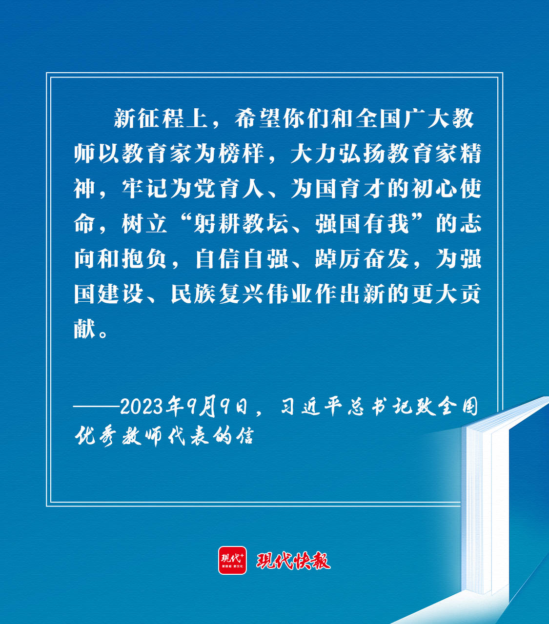2023年9月9日,習近平總書記在致全國優(yōu)秀教師代表的信中強調(diào):“新征程上,希望你們和全國廣大教師以教育家為榜樣,大力弘揚教育家精神,牢記為黨育人、為國育才的初心使命,樹立‘躬耕教壇、強國有我’的志向和抱負,自信自強、踔厲奮發(fā),為強國建設(shè)、民族復興偉業(yè)作出新的更大貢獻。”