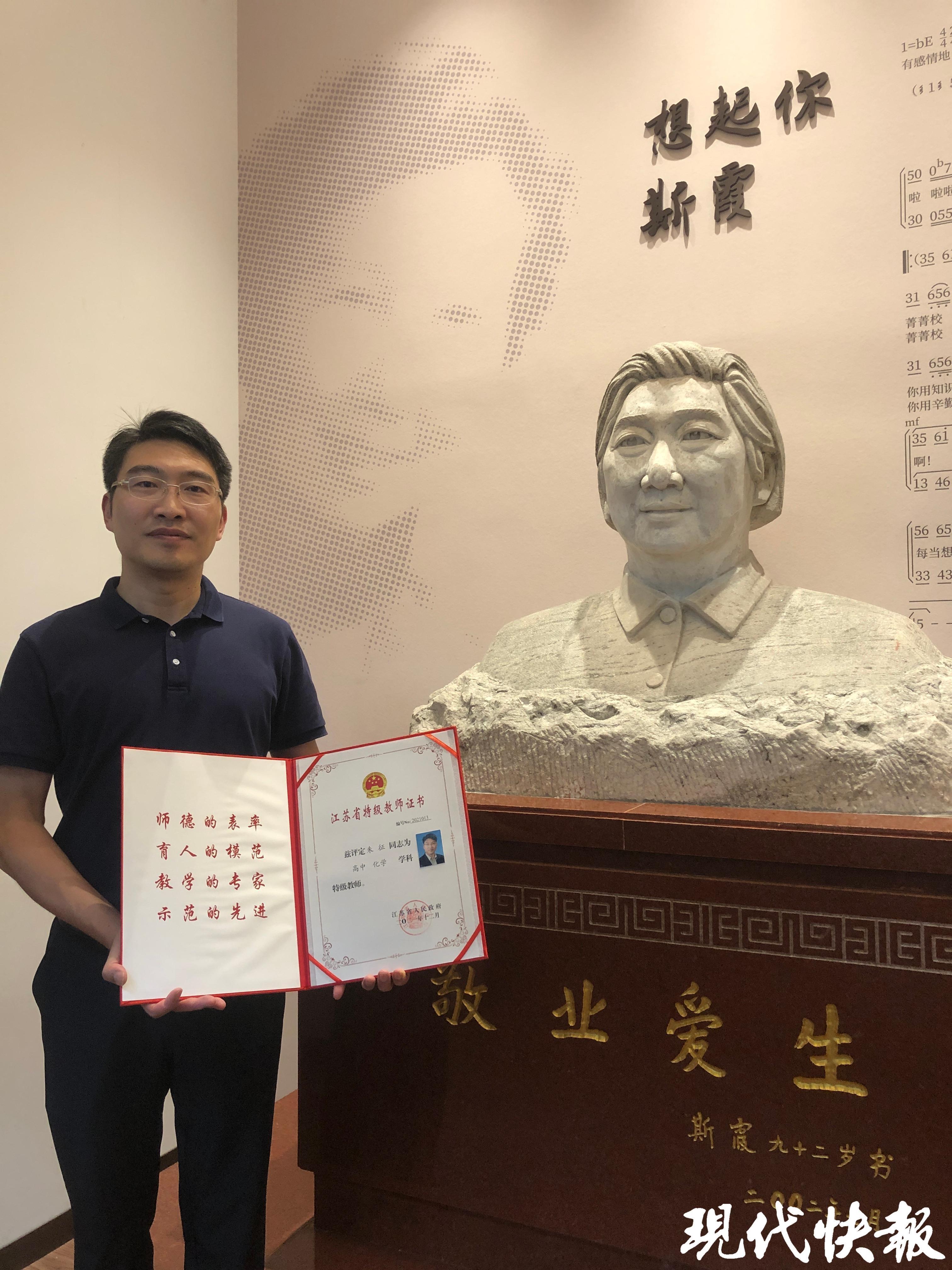 今年9月的一個下午,朱征走進南京市中華中學高一的課堂,為學生們上化學課。朱征是江蘇省化學特級教師,也是中華中學校長,已經(jīng)從教24年。他的另一個身份,是著名教育家斯霞最小的孫輩,從斯霞老師算起,家中三代人出了11位教師。