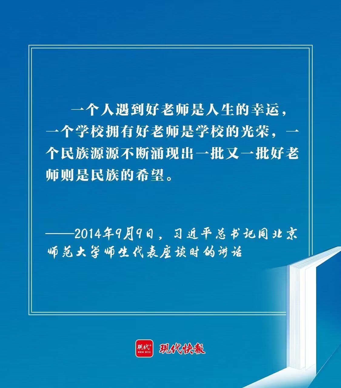 “一個人遇到好老師是人生的幸運,一個學校擁有好老師是學校的光榮,一個民族源源不斷涌現(xiàn)出一批又一批好老師則是民族的希望?!?014年教師節(jié)前夕,同北京師范大學師生代表座談時,習近平總書記的殷殷期盼,激勵廣大教師為民族復興拼搏奮斗。