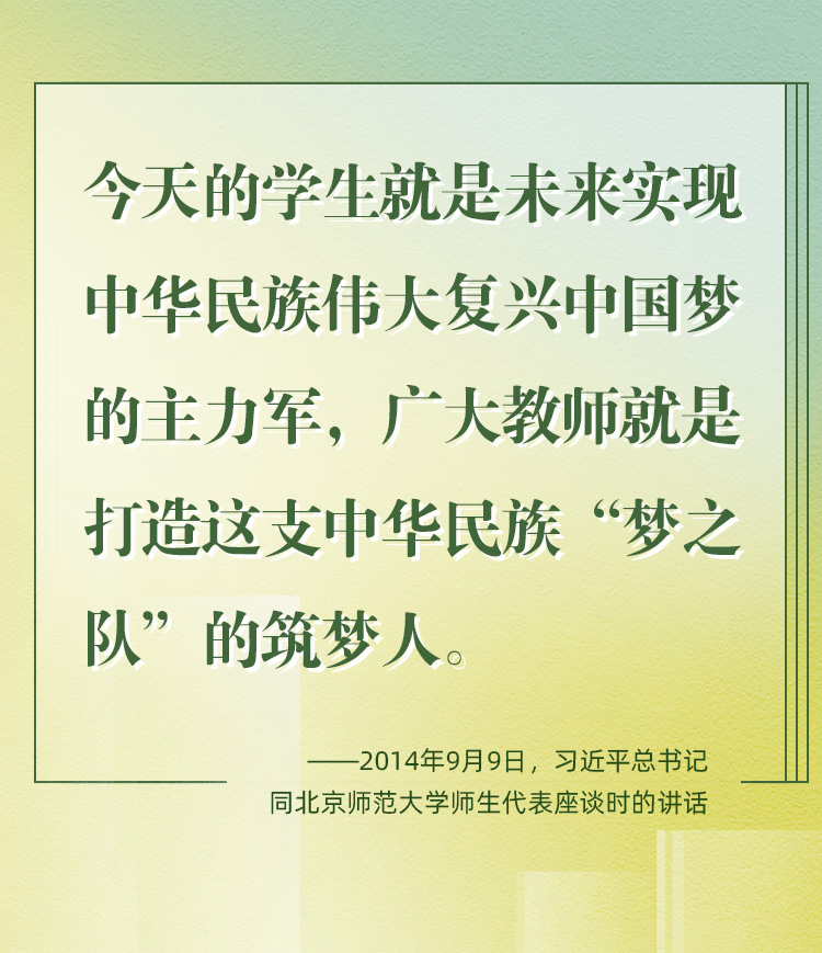 教師是立教之本、興教之源。2024年9月10日,是我國第40個(gè)教師節(jié)。黨的十八大以來,習(xí)近平總書記始終高度重視教師隊(duì)伍建設(shè),立足實(shí)現(xiàn)中華民族偉大復(fù)興中國夢、打造中華民族“夢之隊(duì)”筑夢人的特殊歷史使命,對教師相繼提出了“四有好老師”“四個(gè)引路人”“四個(gè)相統(tǒng)一”“大先生”等殷切期望和明確要求。