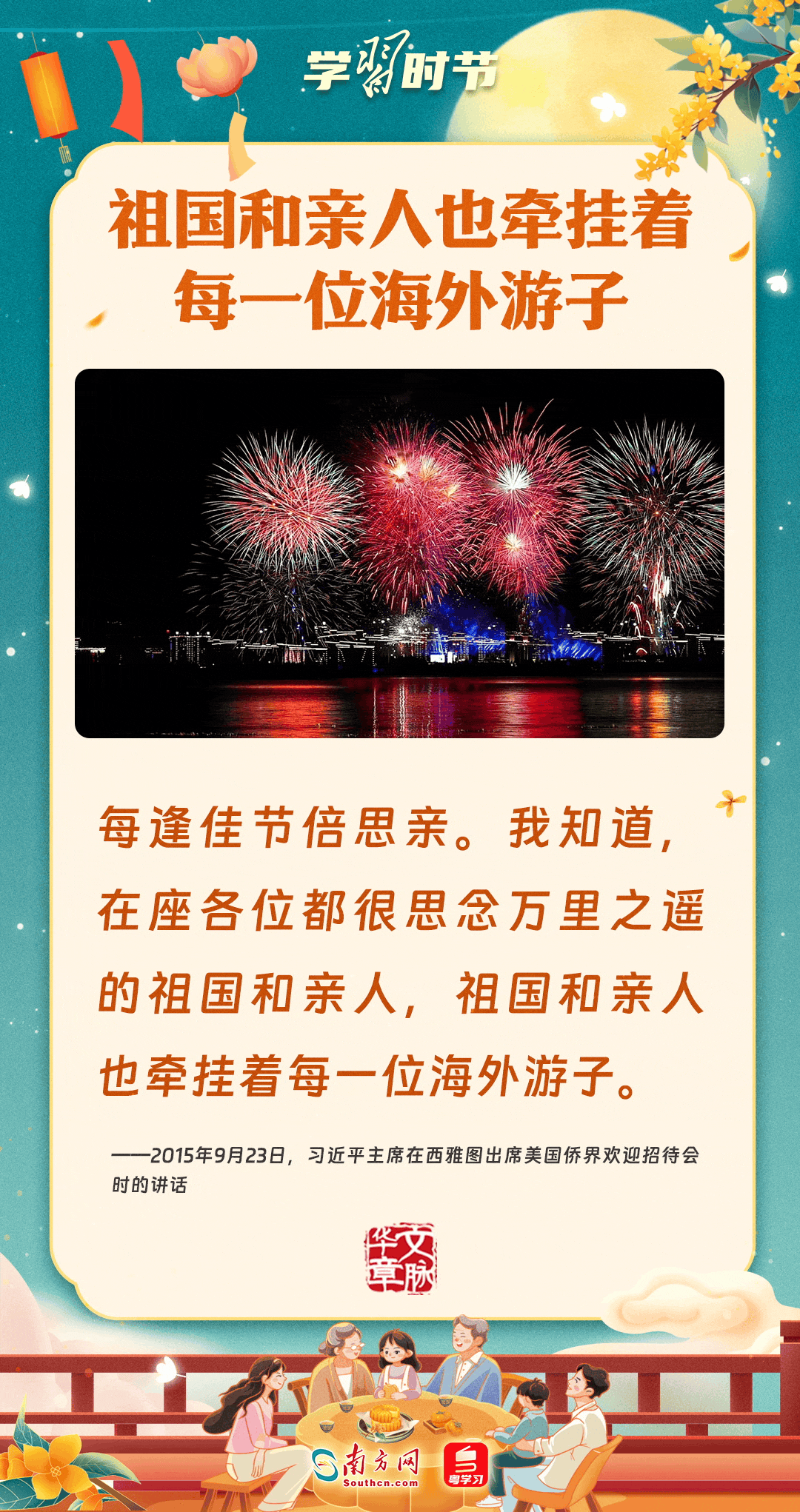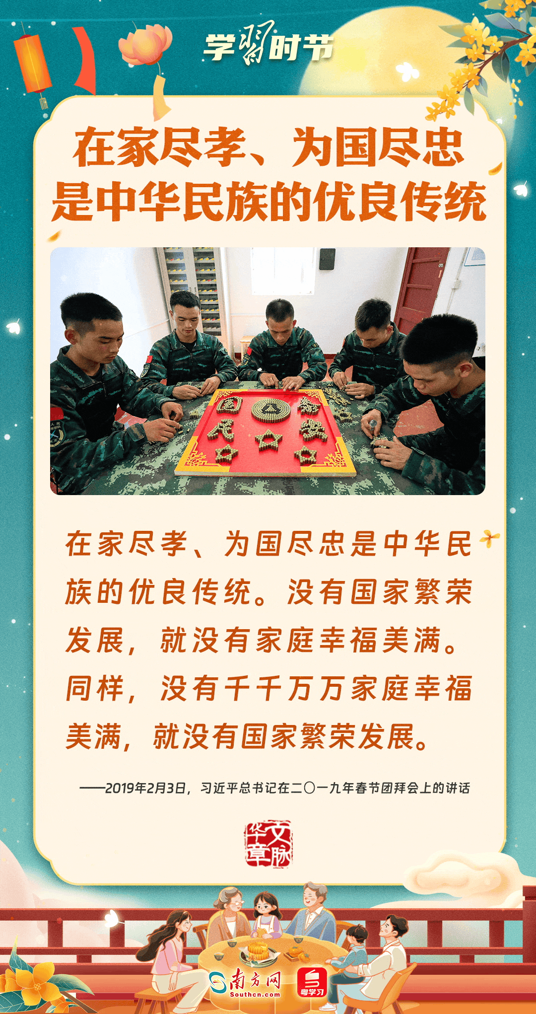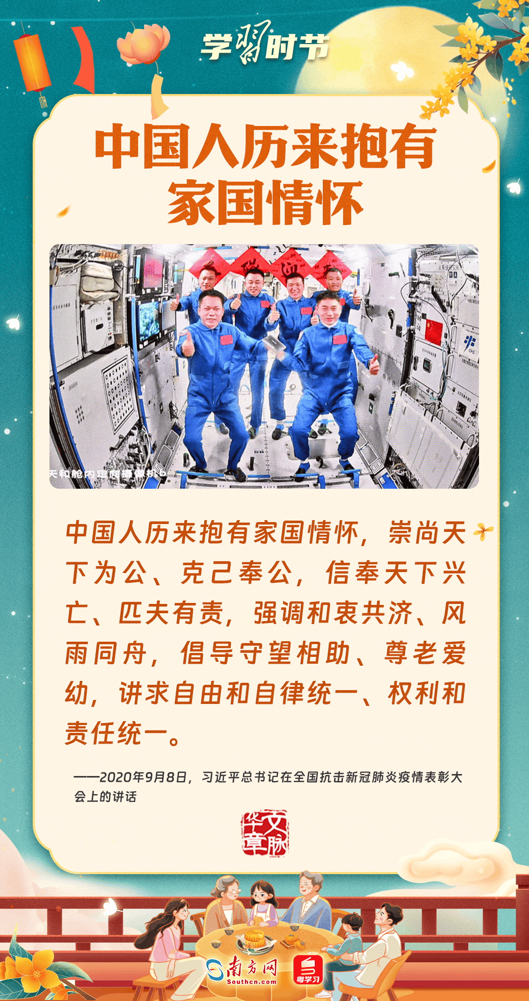 明月寄相思,家國總關情。作為中華優(yōu)秀傳統(tǒng)文化的重要載體之一,中秋節(jié)不但寄托著海內外華人對闔家團圓的美好期許,還承載著深厚的故鄉(xiāng)情、家國情。習近平總書記曾在多個場合深刻闡述個人、家庭與國家之間的關系,強調要厚植家國情懷,把實現個人夢、家庭夢融入國家夢、民族夢之中。中秋佳節(jié),讓我們一起回顧總書記那些經典話語,共同感受他至深至厚的家國情懷。