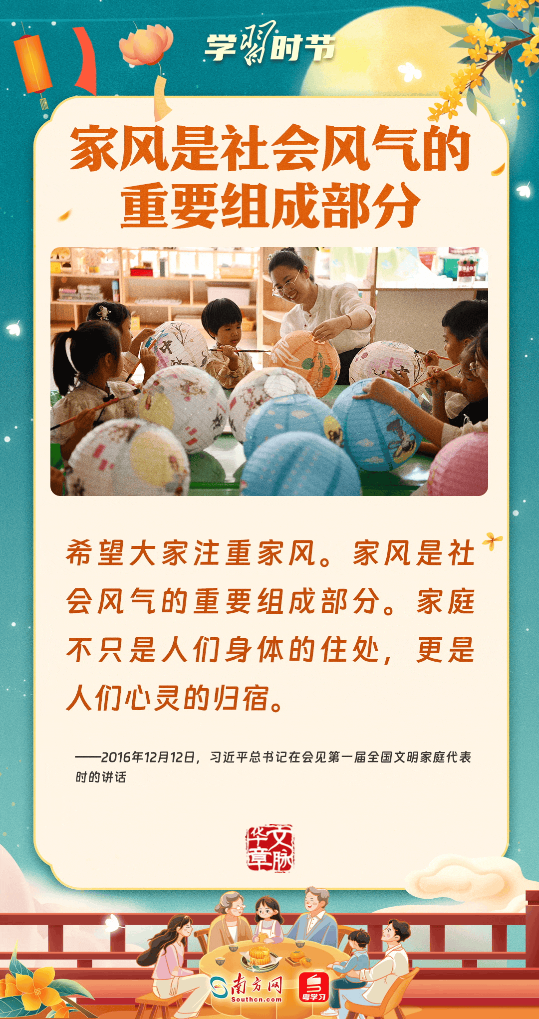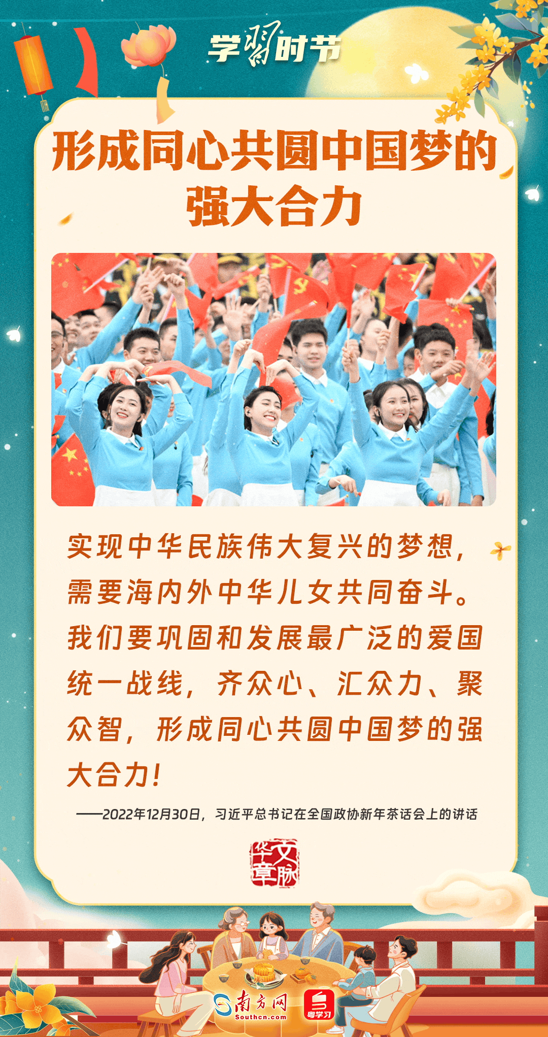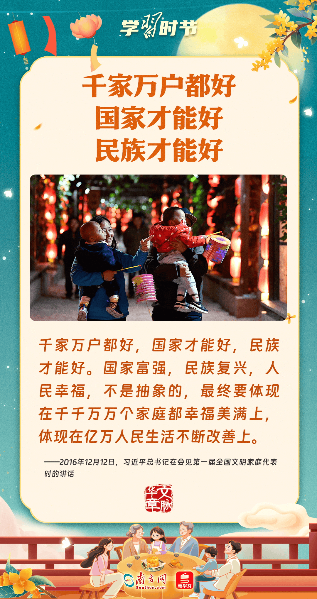 明月寄相思,家國總關情。作為中華優(yōu)秀傳統(tǒng)文化的重要載體之一,中秋節(jié)不但寄托著海內外華人對闔家團圓的美好期許,還承載著深厚的故鄉(xiāng)情、家國情。習近平總書記曾在多個場合深刻闡述個人、家庭與國家之間的關系,強調要厚植家國情懷,把實現個人夢、家庭夢融入國家夢、民族夢之中。中秋佳節(jié),讓我們一起回顧總書記那些經典話語,共同感受他至深至厚的家國情懷。