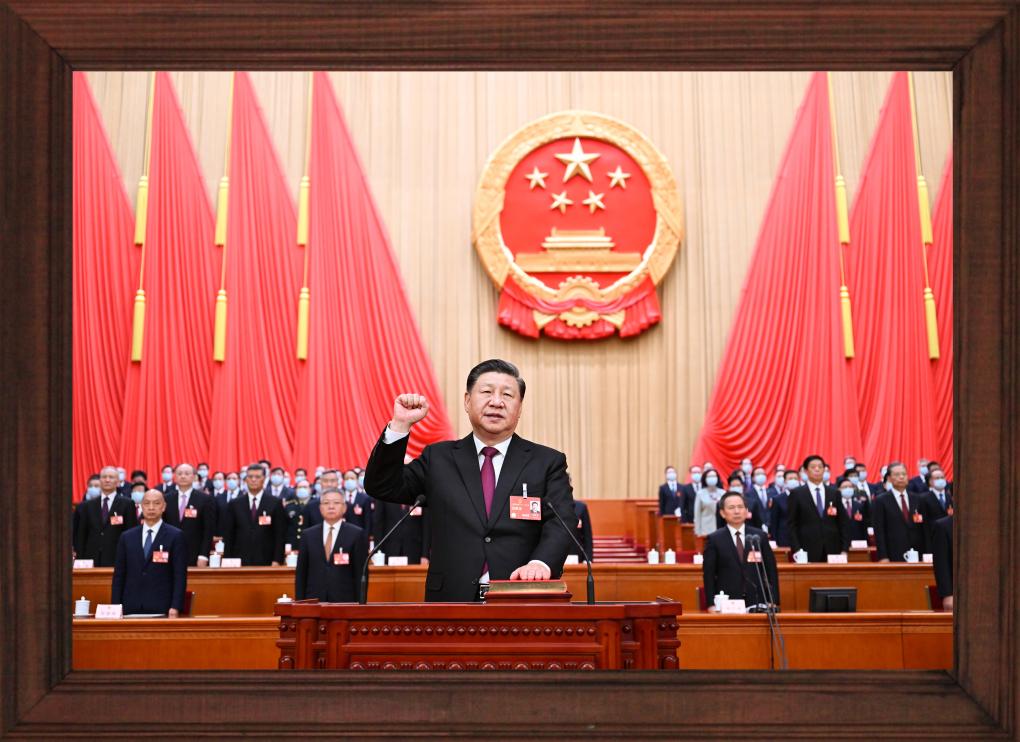 2023年3月10日,北京人民大會(huì)堂。全票當(dāng)選國家主席、中央軍委主席的習(xí)近平,左手撫按《中華人民共和國憲法》,右手舉拳,面向近3000名全國人大代表,鄭重宣誓。