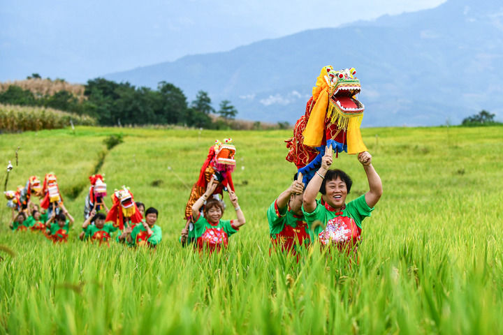 在云南省紅河哈尼族彝族自治州個舊市卡房鎮(zhèn)的旱地優(yōu)質(zhì)稻種植示范區(qū),群眾抬著板凳龍?jiān)谔镩g穿行迎接豐收季的到來(2024年9月20日攝)。新華社記者 王靜頤 攝