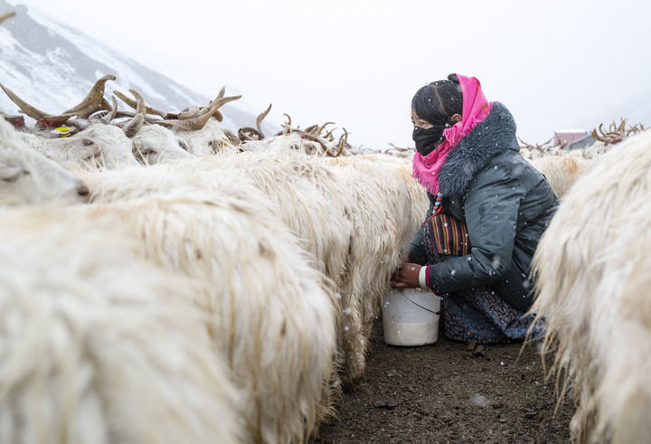 在西藏阿里地區(qū)日土縣龍門卡村白絨山羊擴(kuò)繁場,飼養(yǎng)員在給白絨山羊擠奶(2024年9月13日攝)。新華社記者 孫瑞博 攝