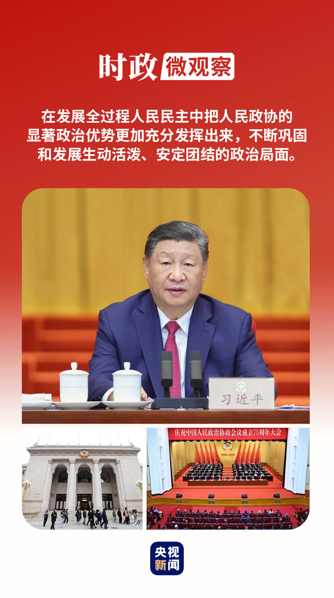 2024年9月20日,全國政協(xié)禮堂,中共中央、全國政協(xié)隆重舉行慶祝中國人民政治協(xié)商會議成立75周年大會。在大會上,習(xí)近平總書記高度評價人民政協(xié)的歷史貢獻,提出新時代人民政協(xié)“十個堅持”的原則,深刻闡述人民政協(xié)的鮮明中國特色和顯著政治優(yōu)勢,對不斷推進協(xié)商民主廣泛多層制度化發(fā)展提出明確要求,對做好當(dāng)前和今后一個時期人民政協(xié)工作作出全面部署。