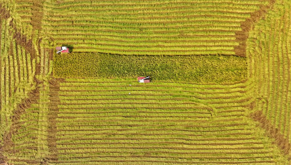 2024年8月22日,收割機在永豐村高標(biāo)準(zhǔn)農(nóng)田內(nèi)收割水稻(無人機照片)。團隊預(yù)計,2024年永豐村高標(biāo)準(zhǔn)農(nóng)田平均畝產(chǎn)將接近800公斤。