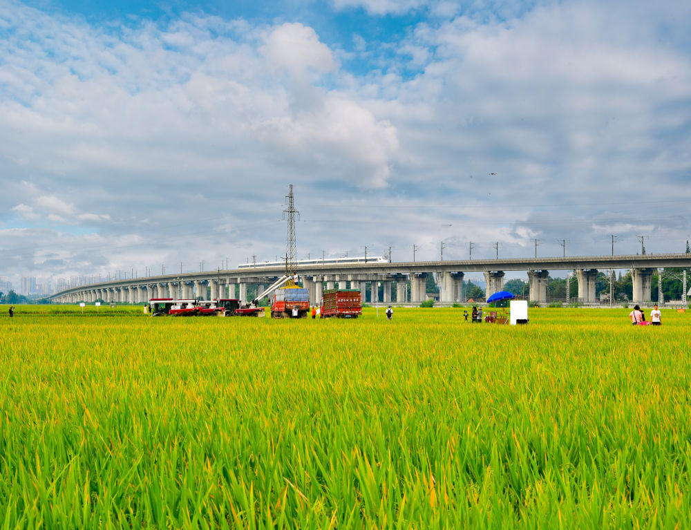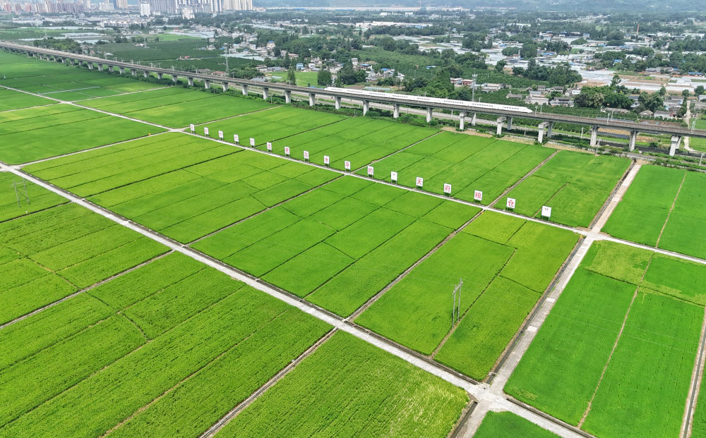 2024年7月26日,一列高鐵列車從永豐村高標(biāo)準(zhǔn)農(nóng)田上方的高架橋上疾馳而過(無人機照片)。過去,永豐村的農(nóng)田不少是“巴掌田”“雞爪田”,如今,細(xì)碎零散的耕地變成了“田成方、土成型、渠成網(wǎng)、路相通、溝相連”的高標(biāo)準(zhǔn)農(nóng)田,連片農(nóng)田實現(xiàn)了全程機械化種植。