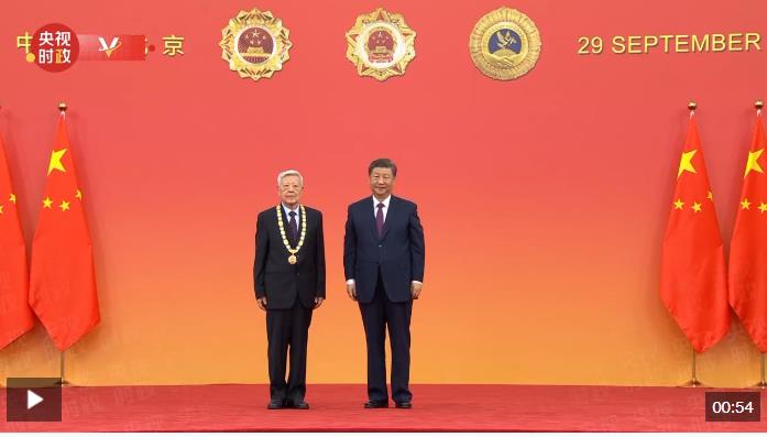 中華人民共和國(guó)國(guó)家勛章和國(guó)家榮譽(yù)稱號(hào)頒授儀式9月29日上午10時(shí)在人民大會(huì)堂隆重舉行。中共中央總書(shū)記、國(guó)家主席、中央軍委主席習(xí)近平向“人民科學(xué)家”國(guó)家榮譽(yù)稱號(hào)獲得者趙忠賢頒授獎(jiǎng)?wù)隆?/p>