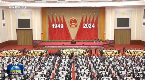 人民大會(huì)堂宴會(huì)廳華燈璀璨,洋溢著喜慶熱烈的節(jié)日氛圍。主席臺(tái)上方高懸著莊嚴(yán)的國(guó)徽,“1949-2024”大字年號(hào)在鮮艷紅旗映襯下格外醒目。