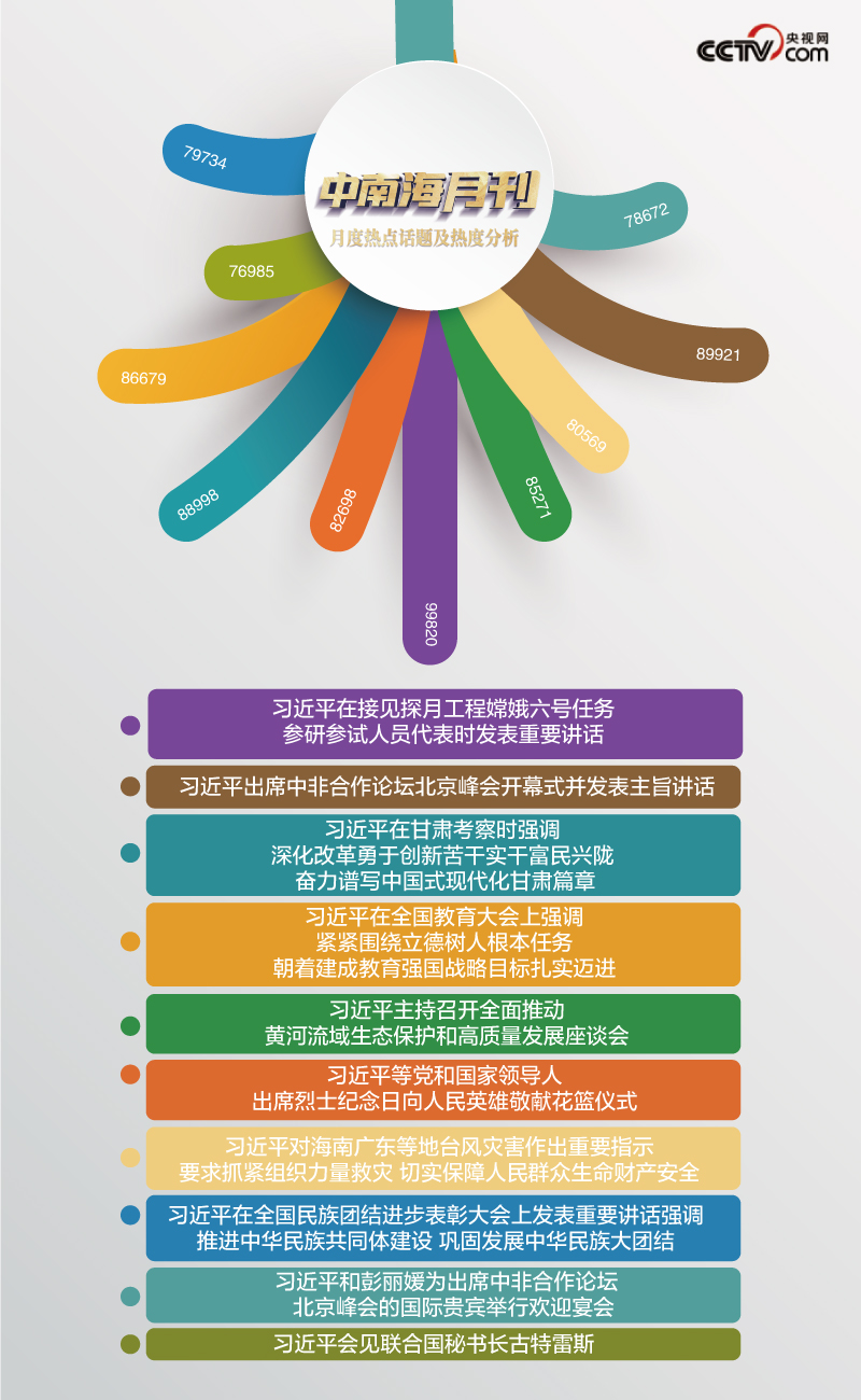 9月,中非深化團結(jié)合作、攜手推進現(xiàn)代化“雙向奔赴”,標注下共筑人類命運共同體的“全球南方時刻”。在央視網(wǎng)“智聞”系統(tǒng)提取分析的9月全網(wǎng)時政新聞熱點中,處處體現(xiàn)著匯聚夢想、激蕩信心的生動局面。