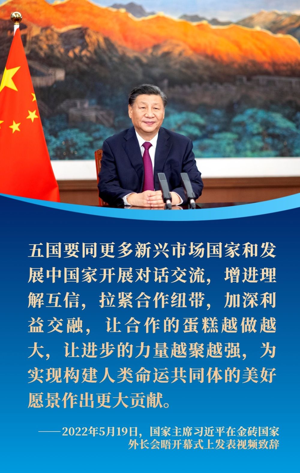 跨越山海,相互成就。中國將同金磚伙伴一道,秉持開放包容、合作共贏精神,堅(jiān)守團(tuán)結(jié)自強(qiáng)初心,繼續(xù)書寫攜手發(fā)展的精彩故事。