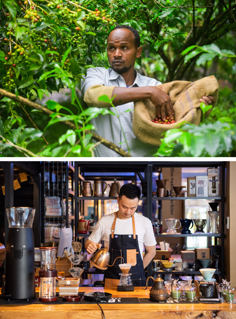 上圖:2021年9月22日,在埃塞俄比亞奧羅米亞州戈馬地區(qū)的一個(gè)咖啡園,農(nóng)民胡森·穆罕默德在采摘咖啡豆;下圖:2021年9月24日,在湖南省長沙市高橋大市場非洲咖啡街一家咖啡館,咖啡師彭杰在制作咖啡飲品。隨著中國開放的大門越開越大、中國咖啡消費(fèi)的快速增長,埃塞俄比亞咖啡在中國越來越受歡迎。