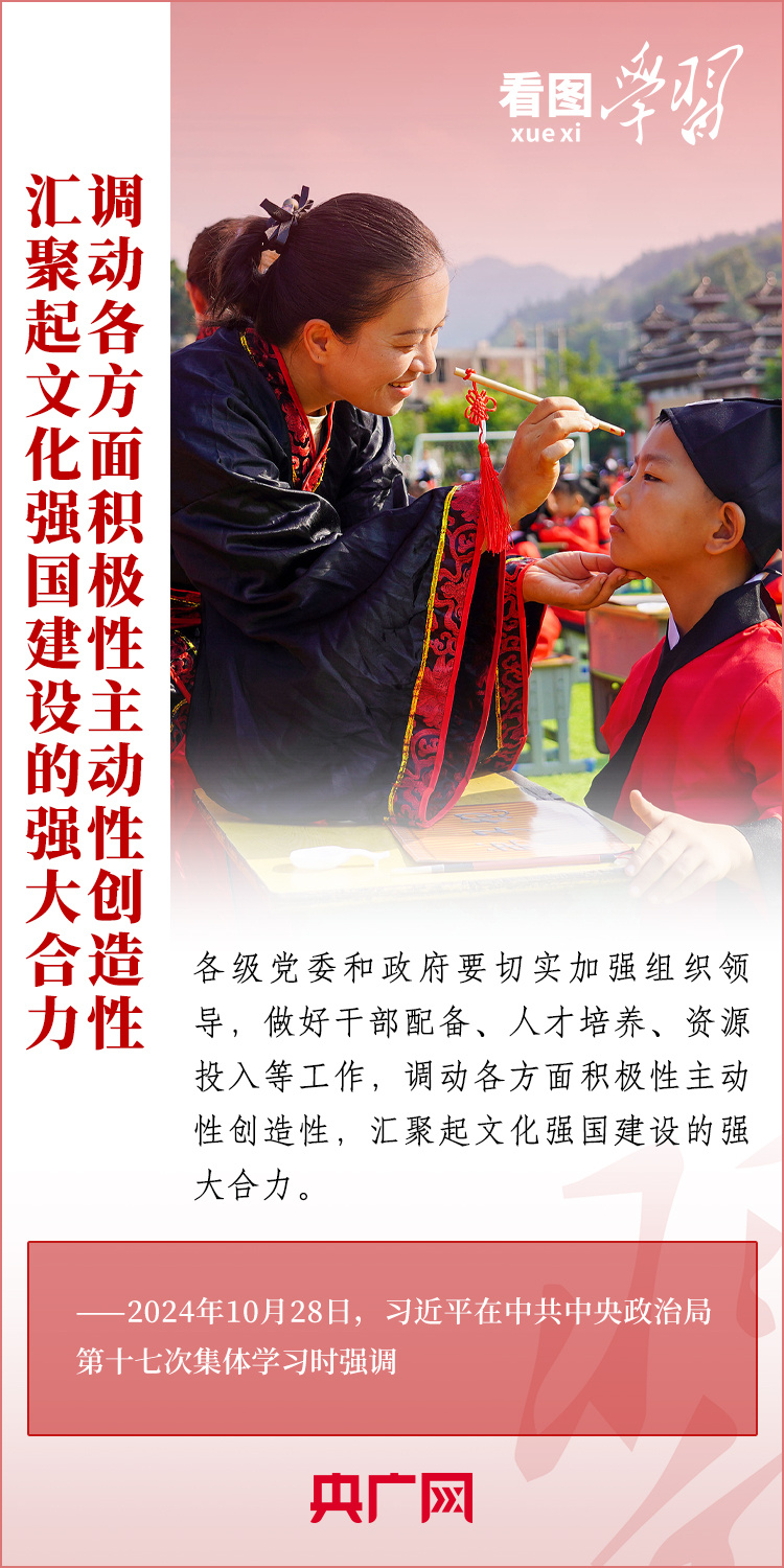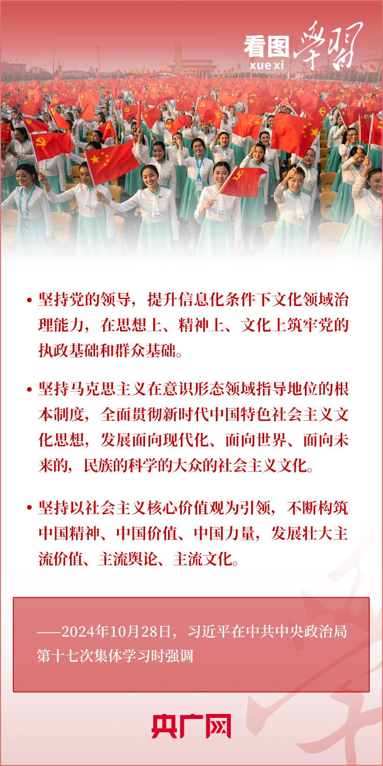 建設(shè)文化強國是全黨全社會的共同任務(wù)。10月28日,中共中央政治局就建設(shè)文化強國進行第十七次集體學習。習近平總書記在聽取講解和討論后發(fā)表重要講話,就錨定2035年建成文化強國戰(zhàn)略目標作出最新部署,強調(diào)要“不斷發(fā)展具有強大思想引領(lǐng)力、精神凝聚力、價值感召力、國際影響力的新時代中國特色社會主義文化,不斷增強人民精神力量,筑牢強國建設(shè)、民族復興的文化根基?!币黄饋韺W習!