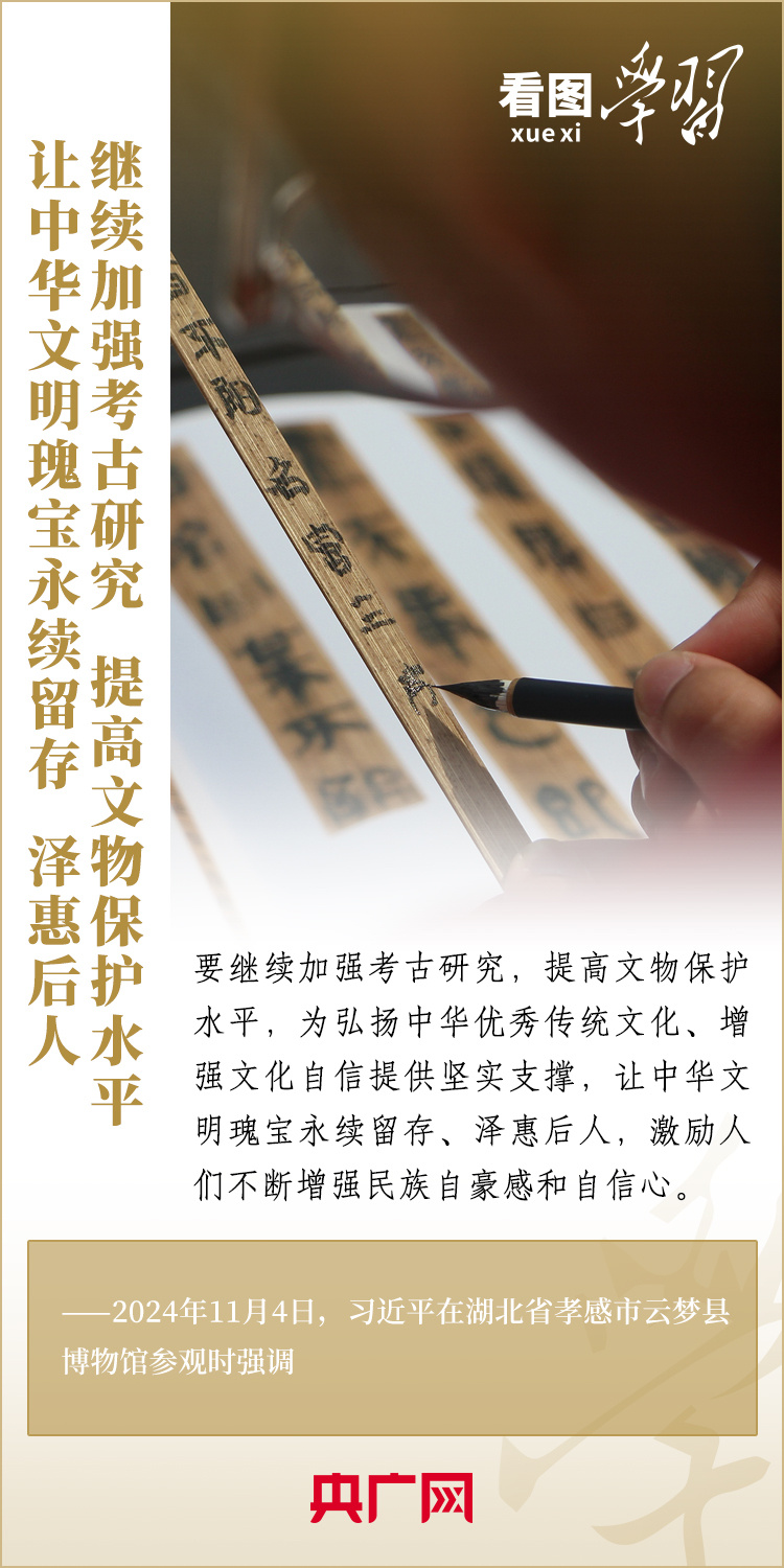 11月4日,習近平總書記在湖北省孝感市云夢縣博物館參觀出土秦漢簡牘展。這里收藏的我國考古史上首次發(fā)現(xiàn)的秦簡——云夢睡虎地秦簡,反映了戰(zhàn)國晚期到秦始皇時期的政治、經(jīng)濟、文化、法律、軍事等方面的情況。習總書記詳細聽取簡牘內(nèi)容、歷史文化價值和保護研究情況介紹,指出要繼續(xù)加強考古研究,提高文物保護水平,讓中華文明瑰寶永續(xù)留存、澤惠后人。