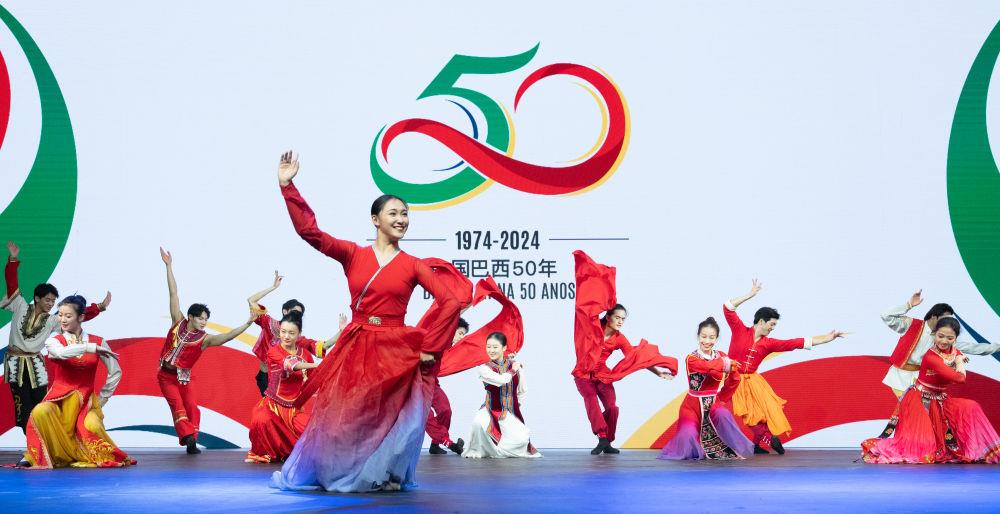 △當(dāng)?shù)貢r(shí)間2024年8月15日,在巴西首都巴西利亞,來(lái)自北京舞蹈學(xué)院民族舞團(tuán)的演員在慶祝中巴建交50周年招待會(huì)上表演。
