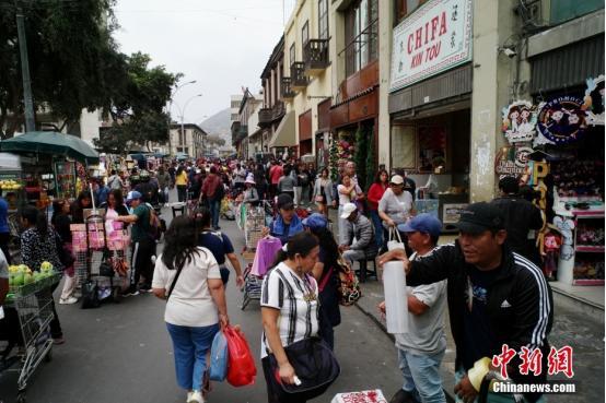 當(dāng)?shù)貢r間11月12日,秘魯首都利馬,唐人街上推銷商品的小販。中新社記者 盛佳鵬 攝