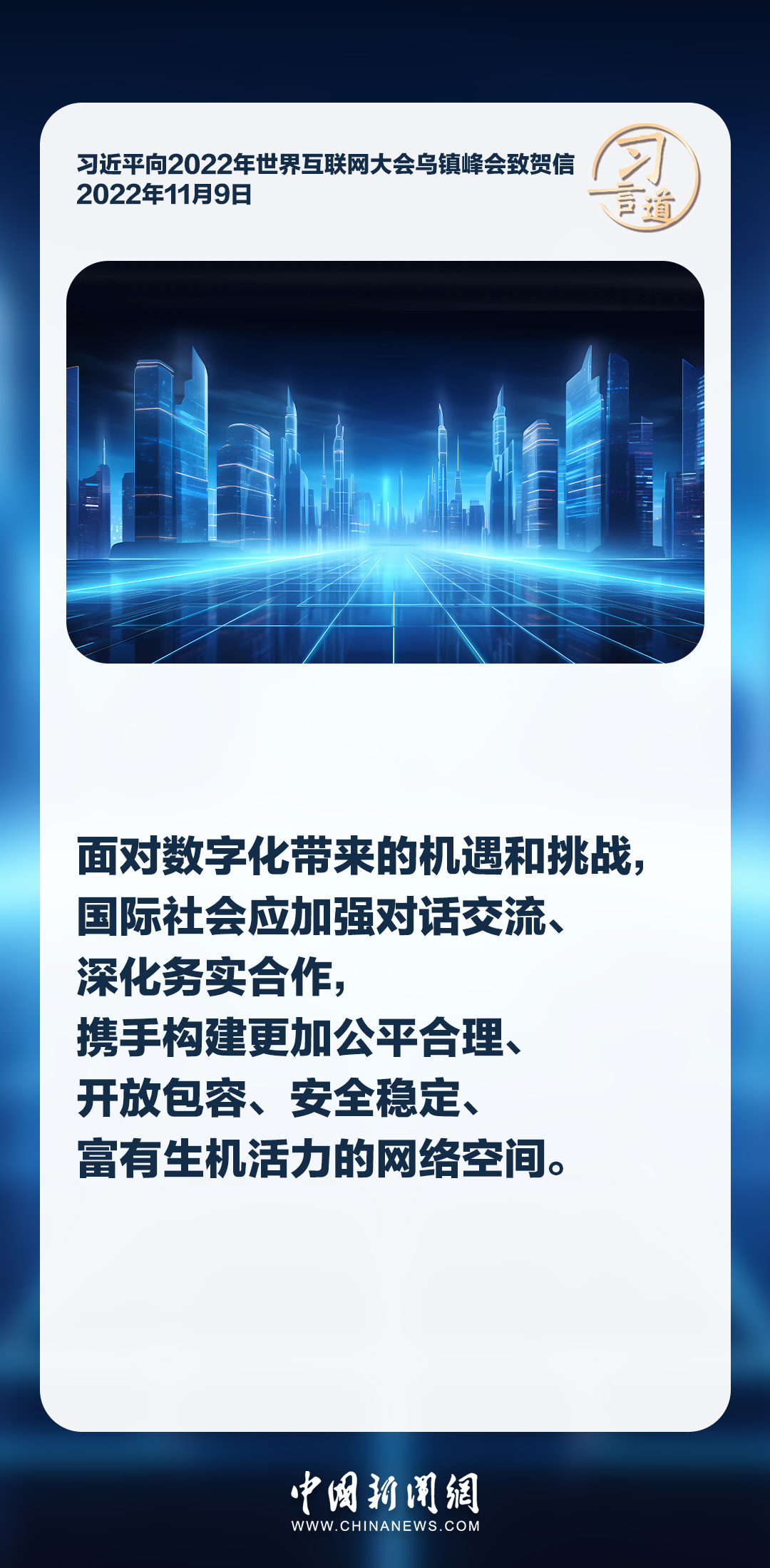 信息革命時代潮流浩蕩前行,網(wǎng)絡(luò)空間承載著人類對美好未來的無限憧憬。習近平主席多次強調(diào)各國應該共同構(gòu)建網(wǎng)絡(luò)空間命運共同體,推動網(wǎng)絡(luò)空間互聯(lián)互通、共享共治,為開創(chuàng)人類發(fā)展更加美好的未來助力。