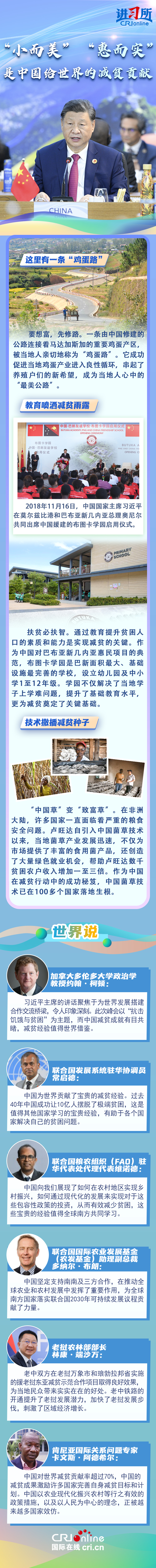 “世界繁榮穩(wěn)定不可能建立在貧者愈貧、富者愈富的基礎(chǔ)之上?!苯陙恚袊恢痹谟脤嶋H行動與世界分享脫貧經(jīng)驗:與東盟國家共同開展鄉(xiāng)村減貧推進計劃,在非洲開展基礎(chǔ)設(shè)施建設(shè)和農(nóng)業(yè)、醫(yī)療等技術(shù)合作援助項目,在拉美援建農(nóng)業(yè)技術(shù)中心......一批批“小而美”“惠而實”的民生項目落地生根,幫助當?shù)孛癖姅[脫貧困。多國人士表示,中國成功打贏脫貧攻堅戰(zhàn)具有世界意義,不僅為發(fā)展中國家提供了借鑒經(jīng)驗,更有助于推動建設(shè)一個共同發(fā)展的公正世界。