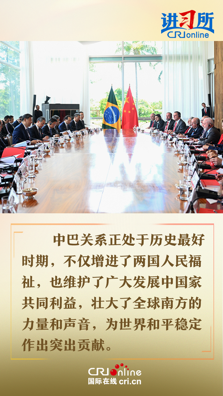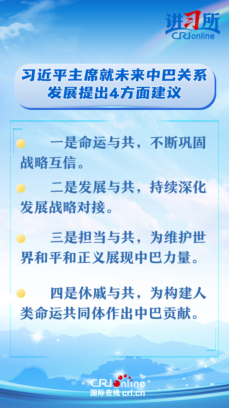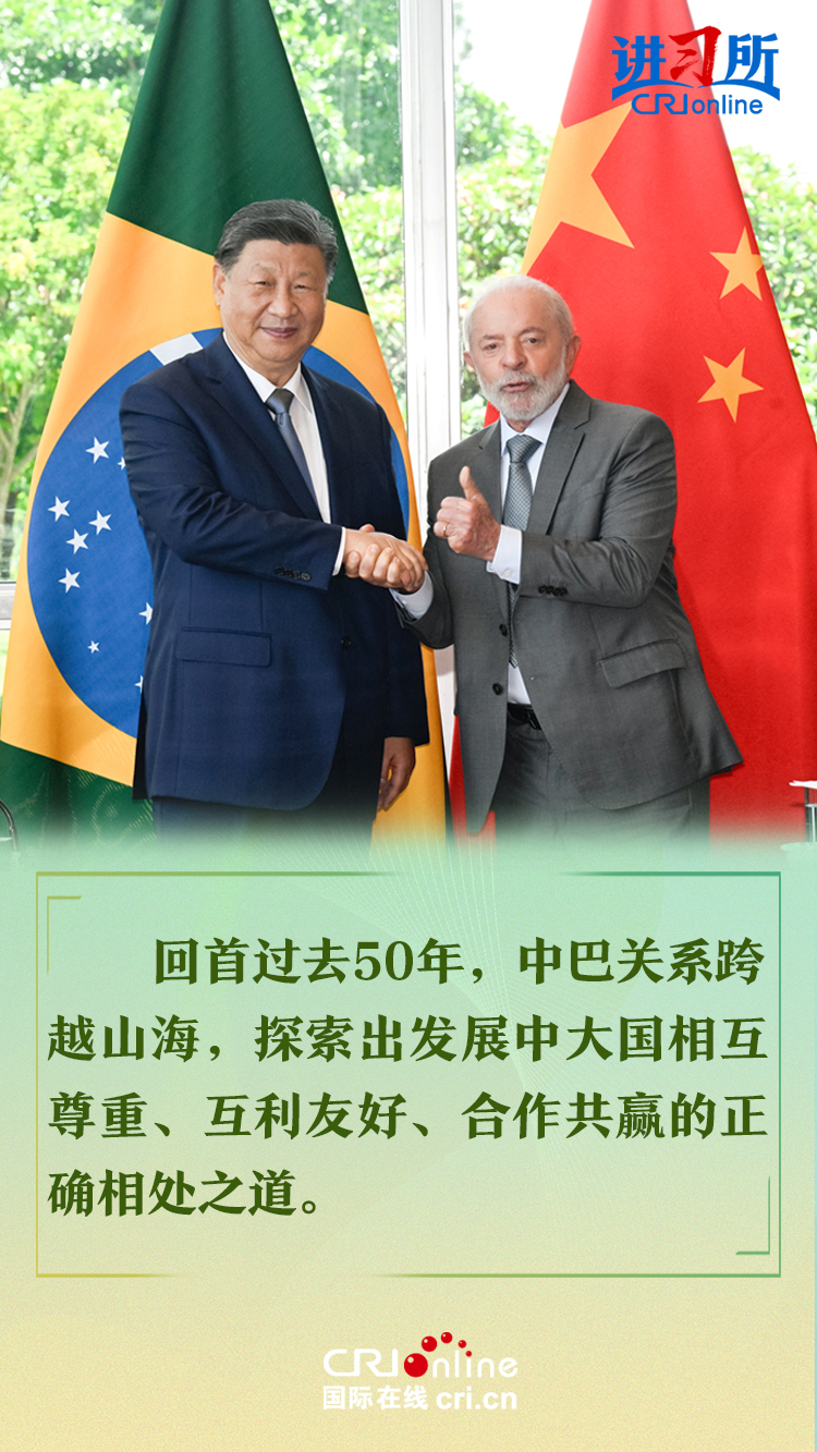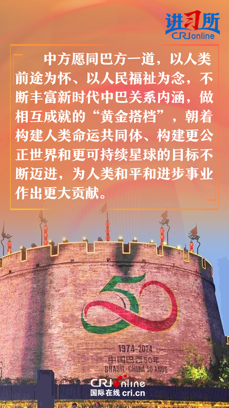 今年是中巴建交50周年。習(xí)近平指出,回首過去50年,中巴關(guān)系跨越山海,探索出發(fā)展中大國相互尊重、互利友好、合作共贏的正確相處之道。中方愿同巴方一道,以人類前途為懷、以人民福祉為念,不斷豐富新時(shí)代中巴關(guān)系內(nèi)涵,做相互成就的“黃金搭檔”,朝著構(gòu)建人類命運(yùn)共同體、構(gòu)建更公正世界和更可持續(xù)星球的目標(biāo)不斷邁進(jìn),為人類和平和進(jìn)步事業(yè)作出更大貢獻(xiàn)。