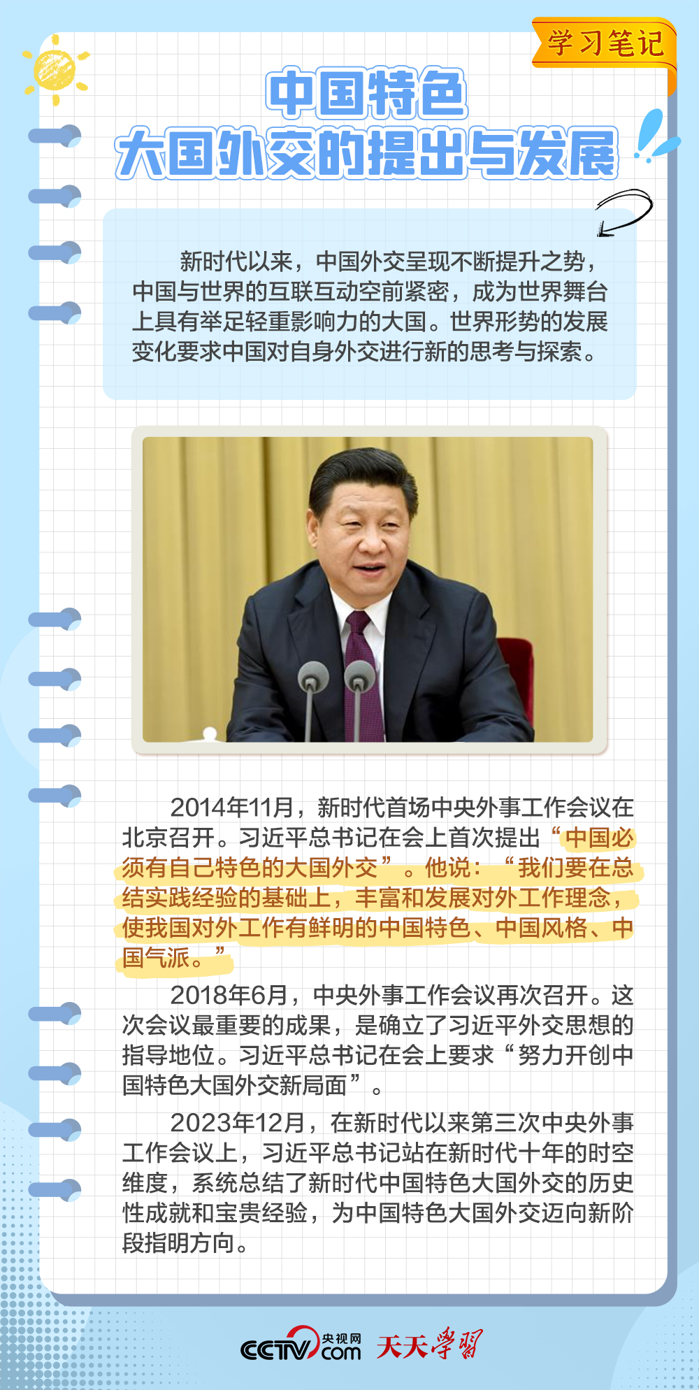天天學(xué)習(xí)2014年11月,習(xí)近平總書記在中央外事工作會(huì)議上指出,中國必須有自己特色的大國外交。