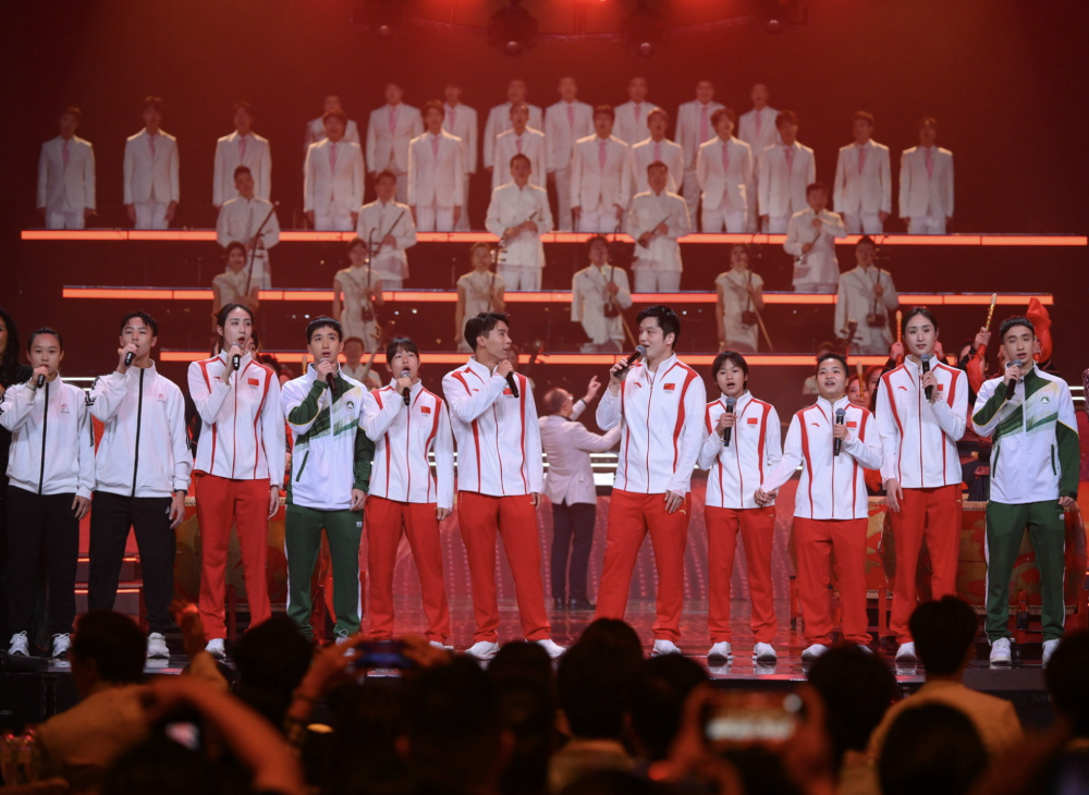 2024年9月22日,在2024“灣區(qū)升明月”大灣區(qū)電影音樂晚會(huì)上,澳門體育運(yùn)動(dòng)員代表與參加巴黎奧運(yùn)會(huì)的內(nèi)地健兒一起演唱歌曲。