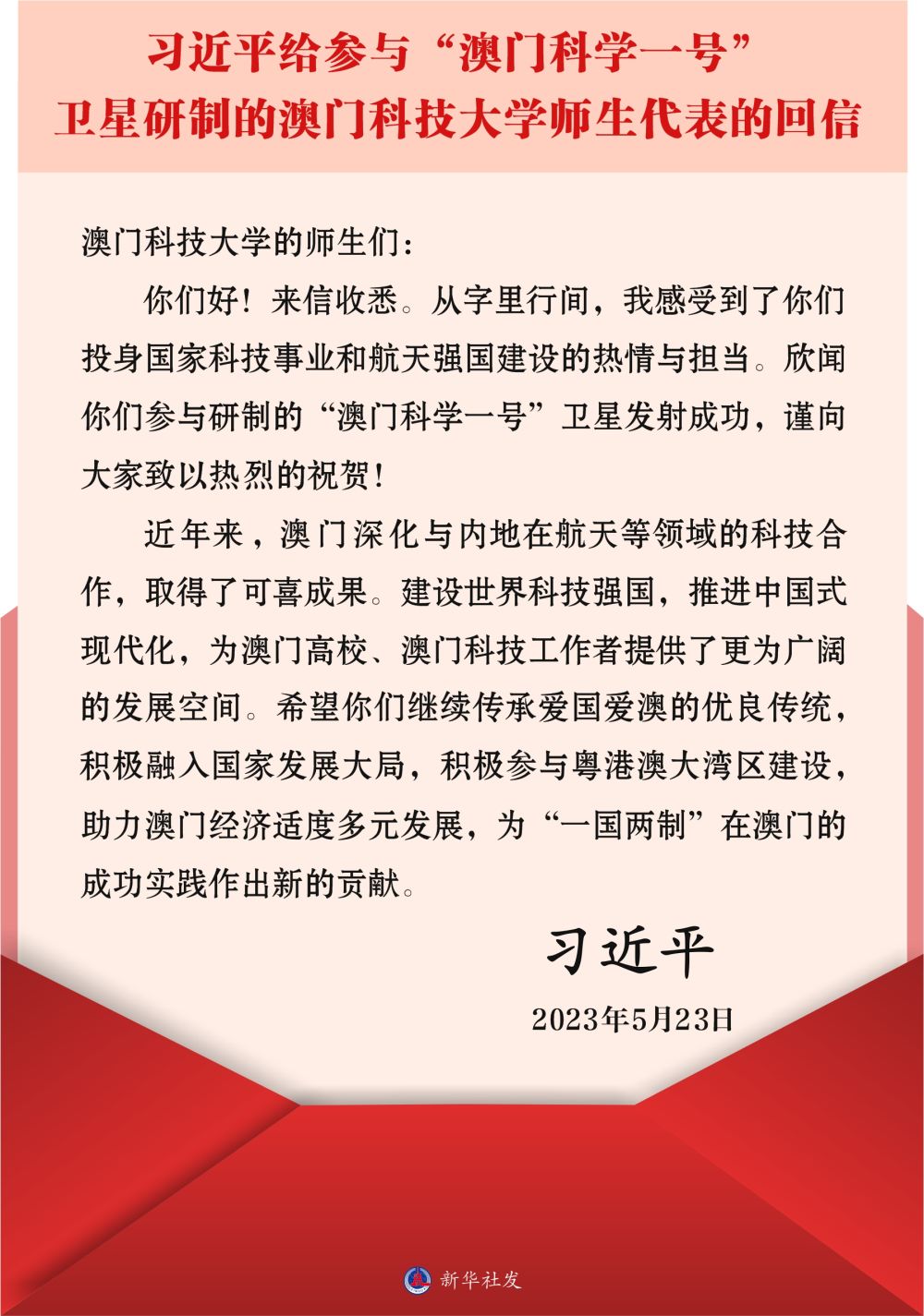 參與衛(wèi)星研制的澳門科技大學18名師生代表給習近平主席寫信,匯報衛(wèi)星成功發(fā)射的喜訊和參與衛(wèi)星研制工作的感受。5月23日,習近平主席給參與“澳科一號”衛(wèi)星研制的師生代表回信,對他們予以親切勉勵。