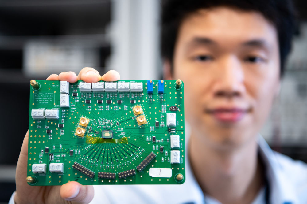 2019年11月1日,研究人員陳知行在模擬與混合信號超大規(guī)模集成電路國家重點實驗室(澳門大學)展示自主設計的模擬數(shù)字轉(zhuǎn)換器芯片。