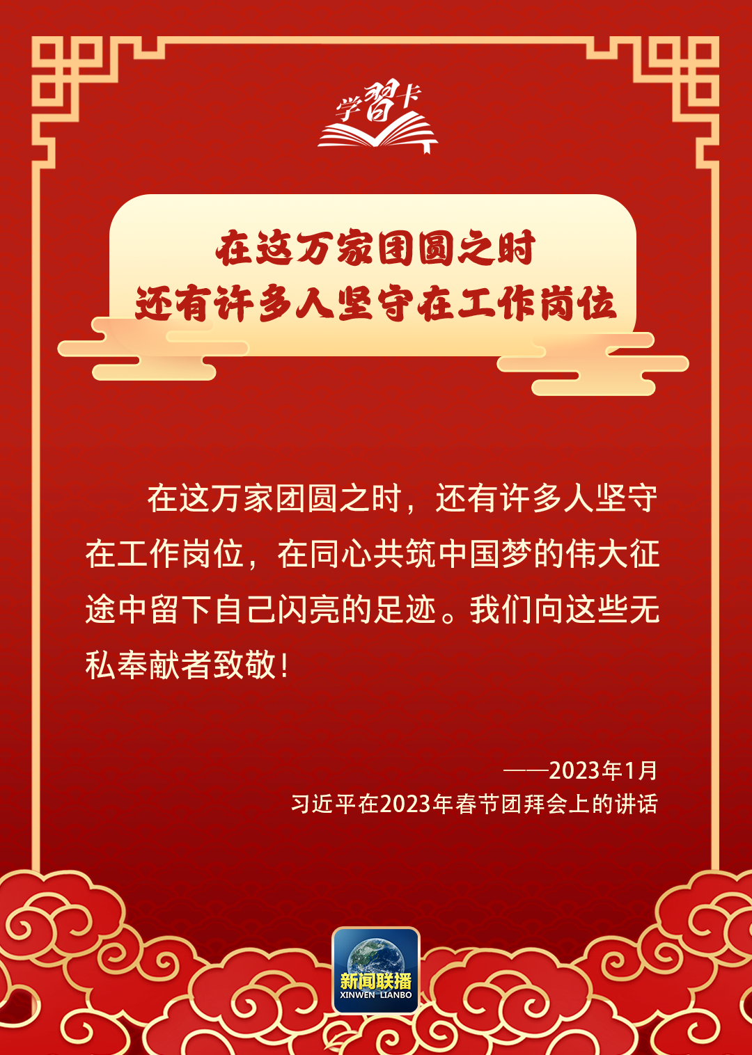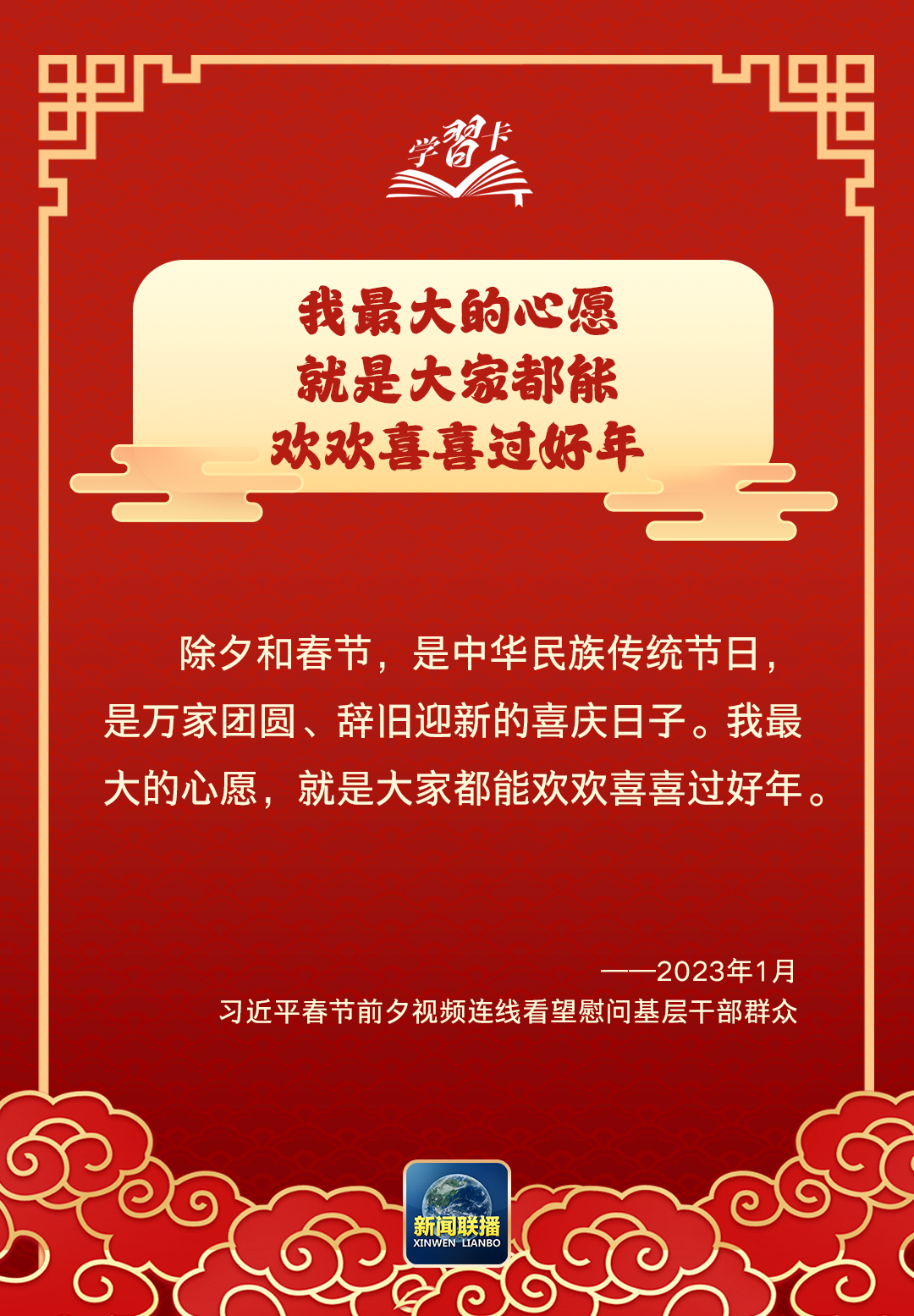 習近平總書記曾說:“我最大的心愿,就是大家都能歡歡喜喜過好年。”在這辭舊迎新、萬家團圓之際,讓我們聆聽總書記的暖心話語,一起學習↓
